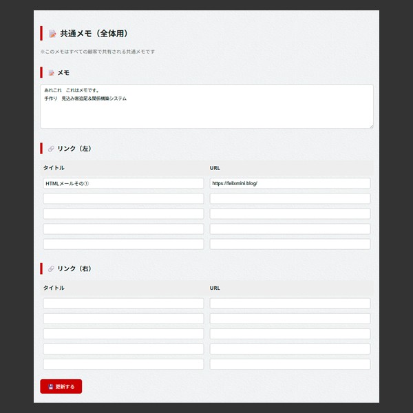 全体メモ&個別メモで情報の抜け漏れゼロ。よく使うリンクも左右カラムで管理。