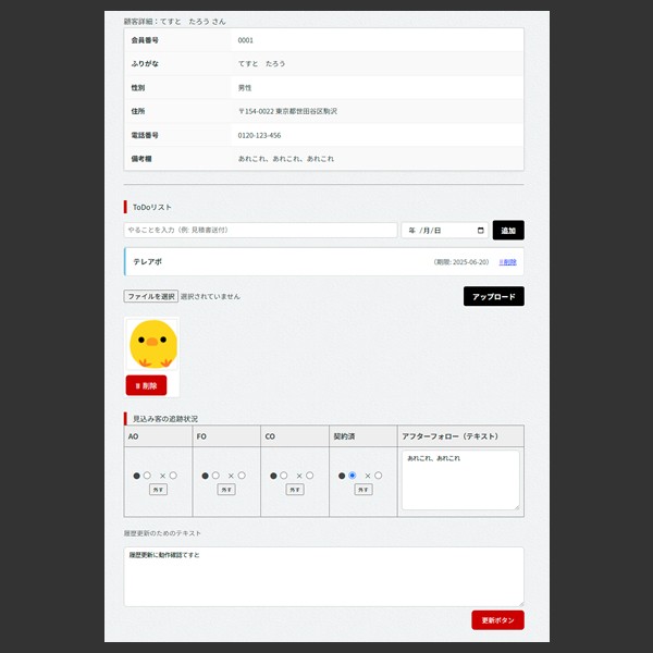 顧客ごとにTODOリスト・期限管理。行動・接触履歴もテキストで残せる。