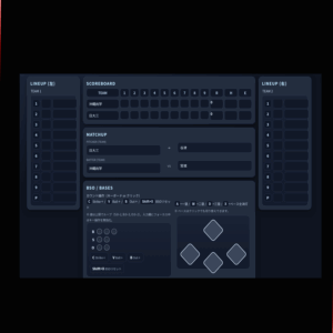 ブラウザで開くだけ。回ごとの得点入力とR自動合計、BSOカウント、塁ランプ、左右ラインナップを一画面に集約。