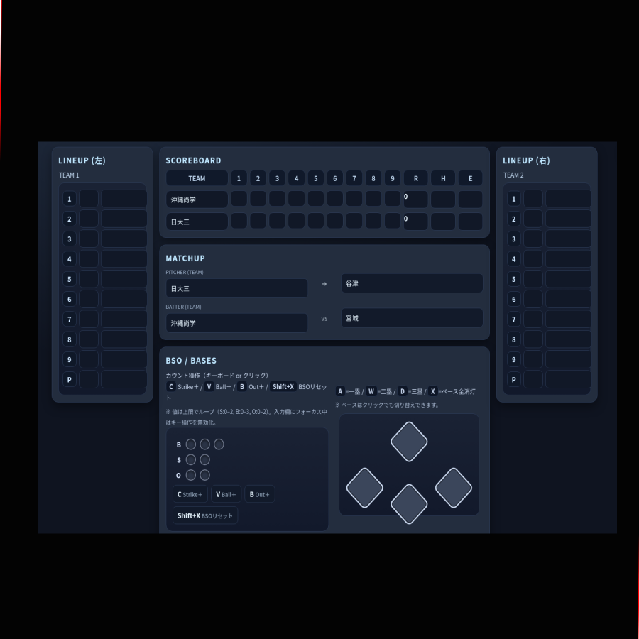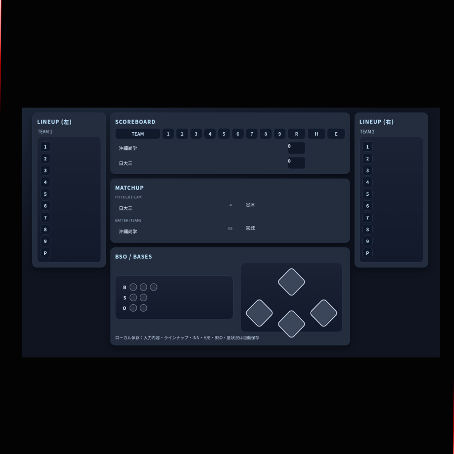 ブラウザで開くだけ。回ごとの得点入力とR自動合計、BSOカウント、塁ランプ、左右ラインナップを一画面に集約。